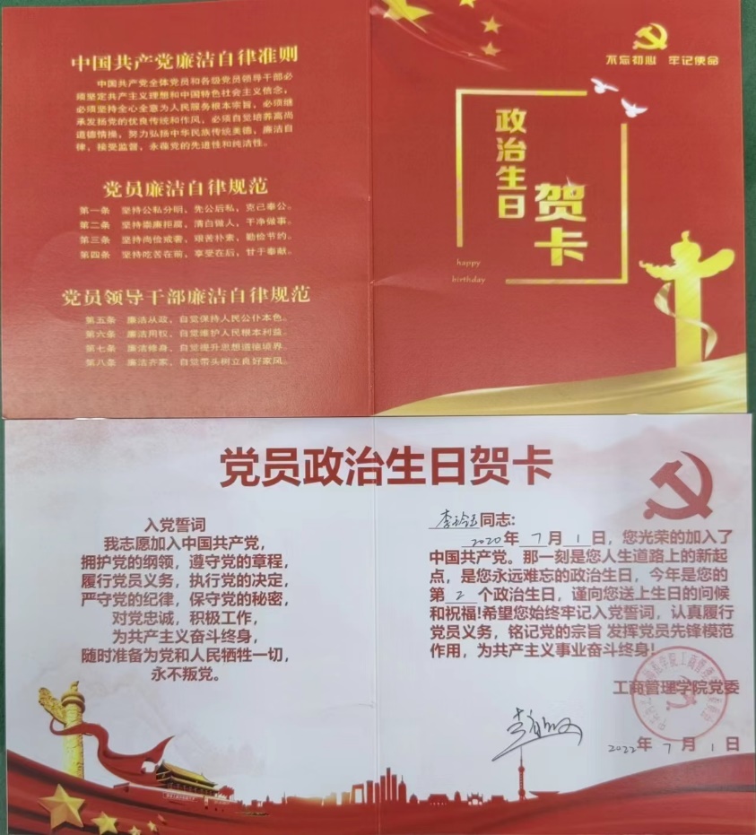 这场别样的“政治生日”活动,由工商管理党委书记赵敏同志向韩晓霞、王燕、柴朝华、李玲玉4名同志颁发了“七一”政治生日贺卡,庆祝这个特殊的日子。通过党委书记发送“政治生日”祝福语、谈心谈话、赠送“政治生日”贺卡、赠送“政治生日”礼物、重温入党誓词、发表“政治生日感言”和前往红色教育基地观摩,重温革命前辈抗日斗争历程等,进一步激发党员同志恪守初心使命,敢于担当奉献,不负党的重任,永葆党员革命本色,为党的建设和发展做出更大的贡献。