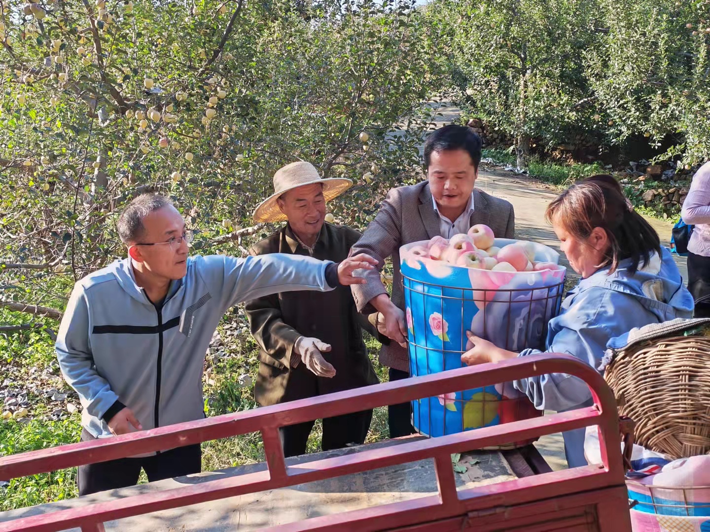 中心组成员们在驻村工作队的安排下,走入苹果种植园,帮扶缺乏劳动力的贫困户采摘苹果,怀着喜悦的心情紧张有序参与准备工具、采摘、剪柄,装框等,每个环节都一丝不苟。通过询问了解到农户的苹果销售存在困难时,中心组成员当即进行销售帮扶。