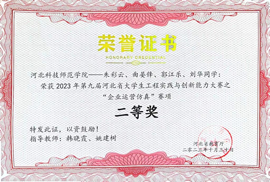 近日,接到河北省教育厅获奖通知,永利yl234116名选手在第九届河北省老员工工程实践与创新能力大赛暨2023年全国老员工工程实践与创新能力大赛选拔赛中,获得“企业运营仿真”赛项的一等奖、二等奖,这是公司首次参加此项赛事。