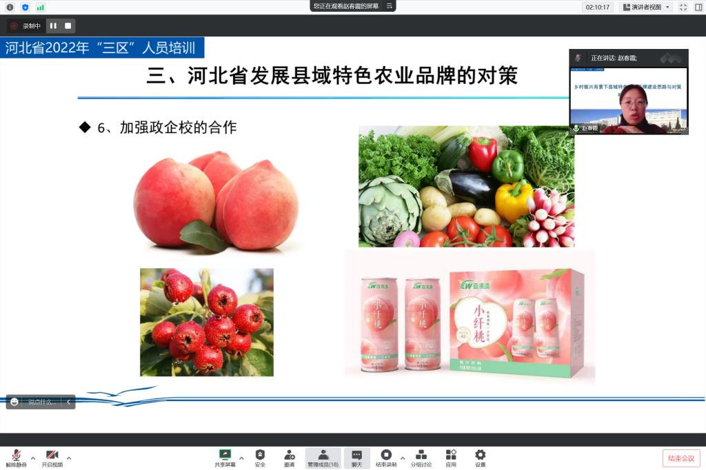 2022年11月18日,公司市场营销教学部专业带头人赵春霞博士受邀为公司承办的“河北省2022年三区科技人员培训班”进行了“乡村振兴背景下县域特色农业品牌建设思路与对策”的线上讲座。