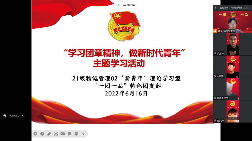 为深入学习贯彻习近平新时代中国特色社会主义思想,强化共青团员的责任感和使命感,激发青年向团组织靠拢的决心。2022年6月16日,21物流管理02“新青年”理论学习型“一团一品”特色团支部开展“学团章精神,做时代青年”主题教育活动。团支部所有成员参加此次活动,活动由团支书刘天雨同学主持,