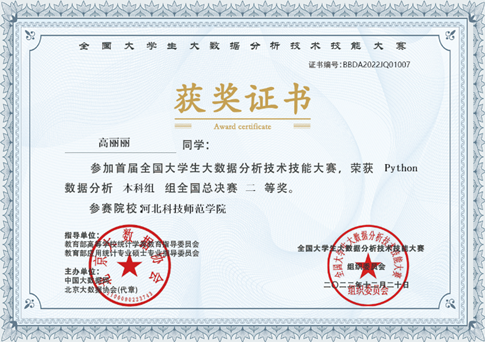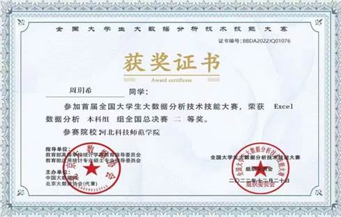 该项比赛是在教育部高等公司统计学类教育指导委员会、教育部应用统计专业硕士专业指导委员会的共同指导下,由中国大数据网联合北京大数据协会联合启动。大赛包括Excel数据分析和Python数据分析两项赛项,周玥希、高丽丽两位同学在2022年11月举行的该项大赛省赛中获得一等奖,取得了参加全国赛的资格。现代表公司在该项大赛全国总决赛中取得佳绩,可喜可贺。(撰稿人:柴朝华,审核人:刘海滨)